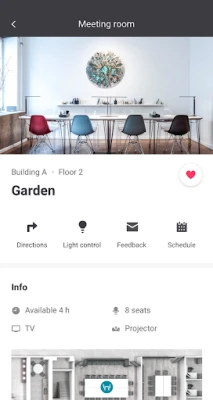 Key features such as • Locate the nearest facilities on the floor based on availability • Find and book meeting rooms on-the-go • Adjust lights based on preferences • Indoor positioning allows you to work smart and to comfortably do your job.
