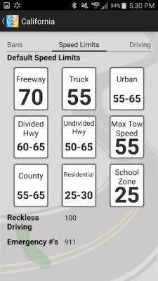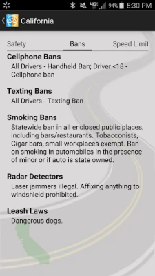 Currently State Lines tracks over 55 pieces of travel relevant information for each of the 50 states; including cell phone & texting bans, seat belt & child safety seats, state sales tax exemptions, gas/diesel taxes, bottle deposits, time zones, towing & RV specific laws, rest area overnight parking limits, state park camping entrance fees, default speed limits, radar detectors, highway emergency #s, alcohol sales laws & taxes, smoking bans, open container laws, pet leash laws, bicycle helmet laws, motorcycle laws (helmet, lights, eye protection & lane sharing), left turns on red, u-turns, keep right and more.